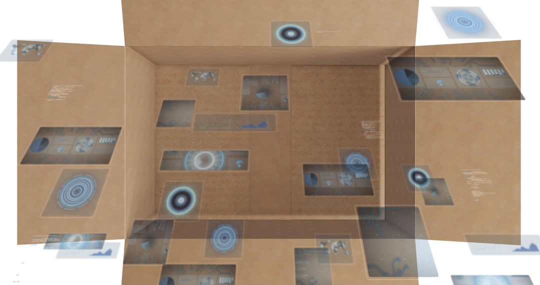 Depiction of a digital interface interacting with holographic elements against the backdrop of a box. Futuristic data processing offers insight into global delivery and shipping processes. Ideal for illustrating advanced technological advancements in logistics, tech presentations, and innovation in digital platforms.