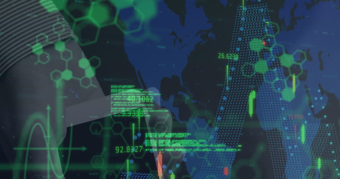 This illustrates an animated digital interface displaying global data with a focus on technology and innovation. It's ideal for conveying themes of data analysis, digital transformation, and modern business strategies. Suitable for websites, presentations, and content about technological advancements and the integration of digital tools in global operations.