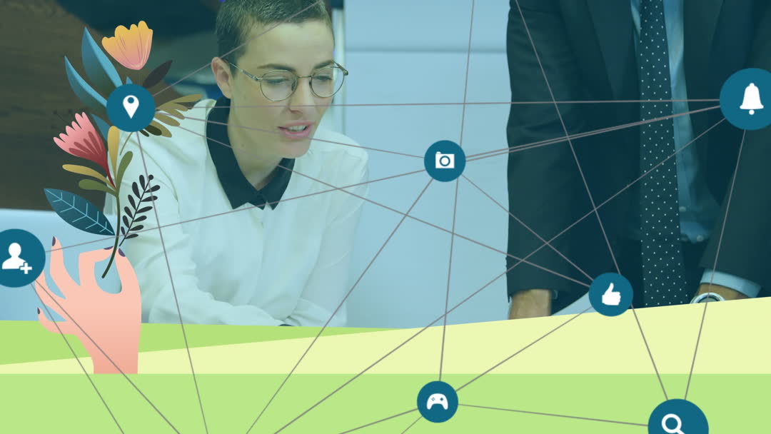 Innovative design combining digital interface icons with a diverse work environment where a team engages in professional collaboration. Suitable for use in presentations focusing on modern business practices, technology integration in the workplace, and networking strategies.