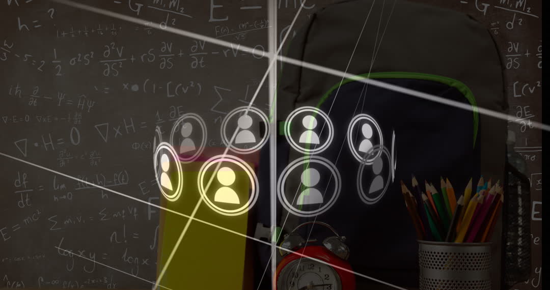 Animation showcasing digital connectivity and learning innovation, incorporating a school setting with supplies and math equations. Useful for illustrating advancements in educational technology, e-learning concepts, and distance education platforms.