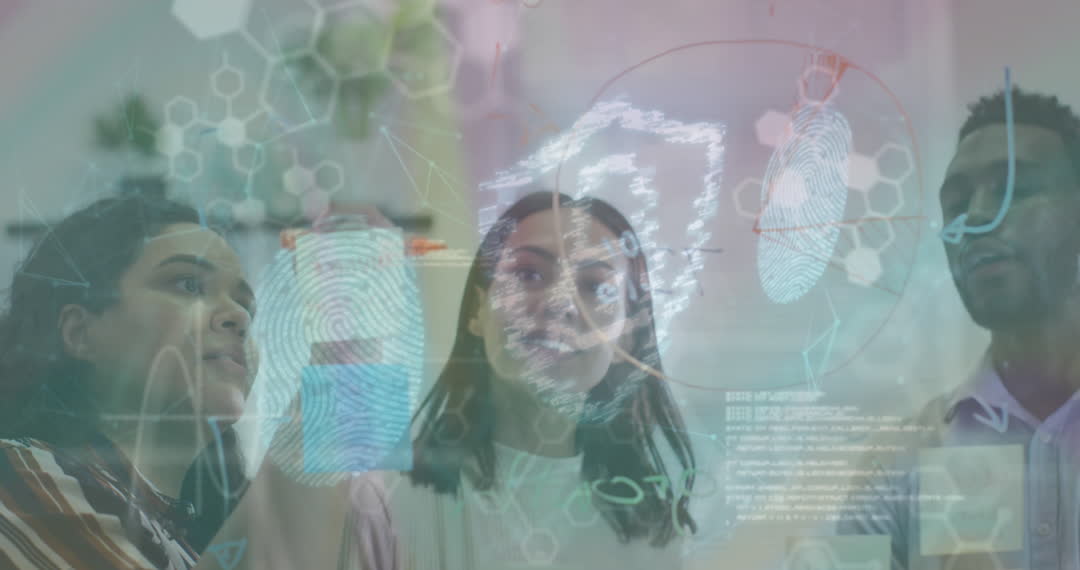 Overlay of biometrics and digital diagrams depicts team conceptualizing future tech solutions. Great for content on cybersecurity trends, teamwork in tech innovations, and workplace diversity. Useful in illustrating digital transformation across industries.