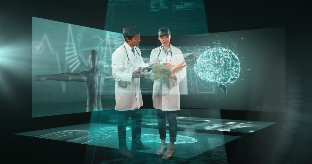 Two doctors discuss advancements in medical technology in a digital setting. Use this visual for conveying themes of innovation in healthcare, modern medicine developments, or technology-driven medical research in presentations or articles.