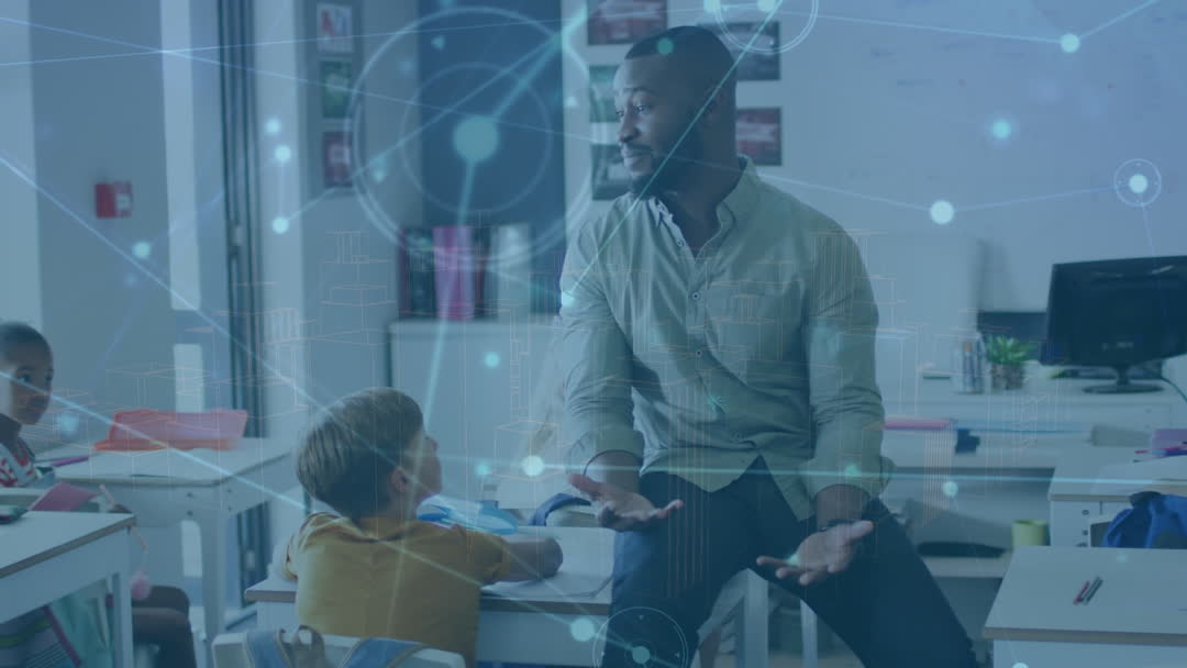 Teacher engaging with diverse students in a classroom, depicted alongside digital network and city graphics. Highlights integration of technology into education, promoting STEM learning and global connectivity. Useful for educational materials, promotional content about technology in teaching, and insights into innovative learning environments.