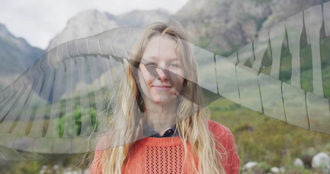 Video presents a woman standing in a beautiful mountainous landscape with a transparent DNA graphic sweeping across her torso, symbolizing the intersection of nature and technology. Her gentle smile and serene expression add a human touch, providing contrast between organic and digital elements. This creative and modern visualization can be used in tech promotions, innovative lifestyle advertisements, and content focused on the fusion of science and emotion. Perfect for conveying themes of integration and forward-thinking developments.