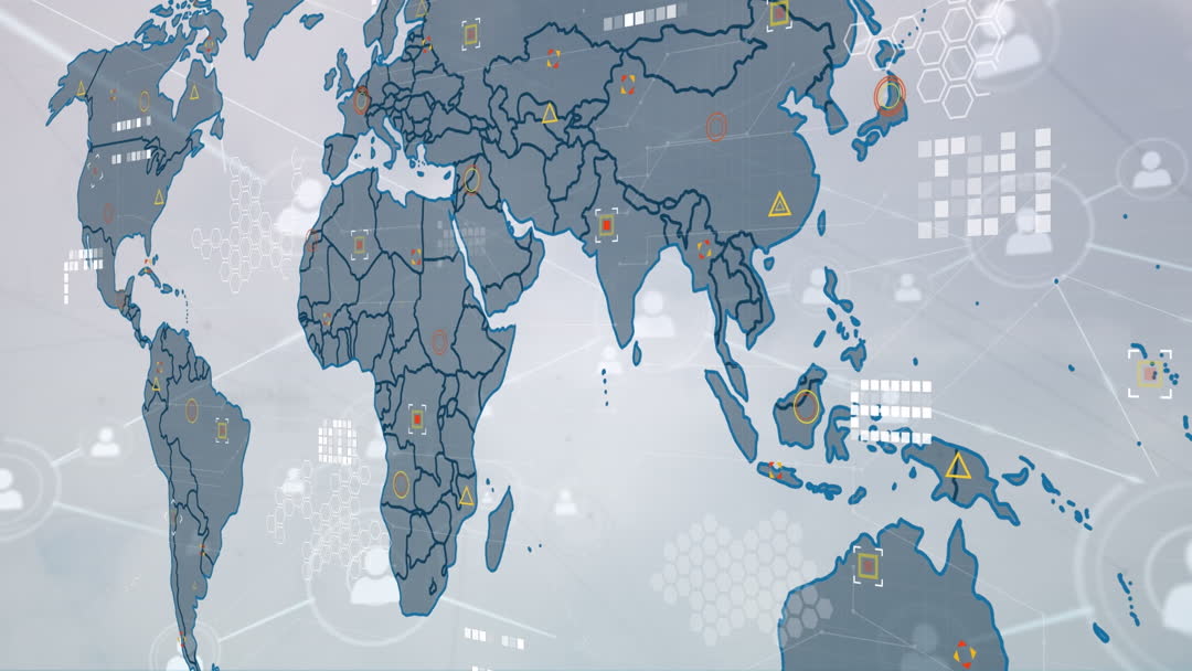 A digitally generated representation of a global map with data processing icons indicates technological progress and information analysis. Ideal for use in presentations on global business strategies, tech innovations, or analytics and data science features.
