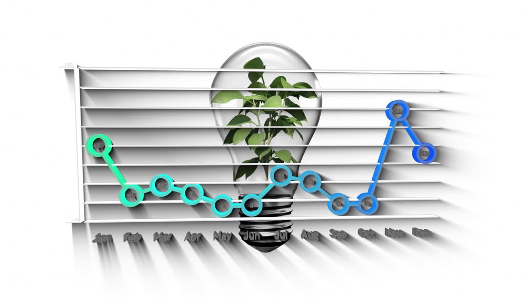 Conceptual video depicting the correlation between growth and innovative processes. The light bulb symbolizes ideas and innovation, while the plant represents growth. The chart overlay indicates progress throughout the months. Useful for presentations, environmental startups, business growth reports, and educational material focusing on innovation and progress over time.