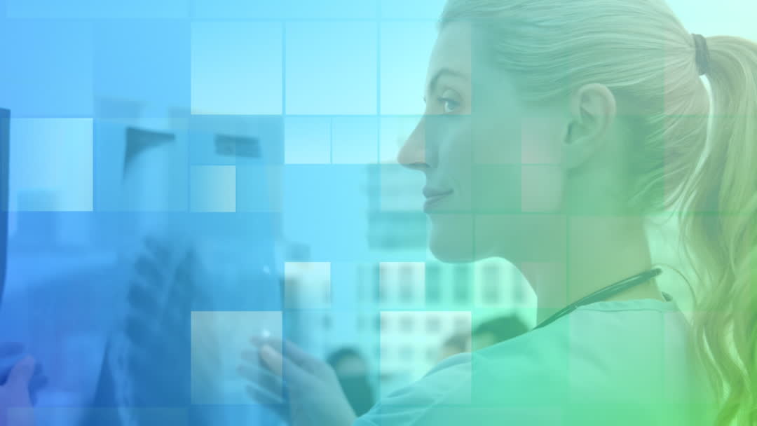 A white female doctor examining an X-ray with digital overlay of colorful squares symbolizes the integration of healthcare and technology. This visually represents medical innovation and computer advancements in the healthcare industry. Useful for content on digital medical technologies, modern healthcare strategies, and doctor-patient interaction in a digital age.