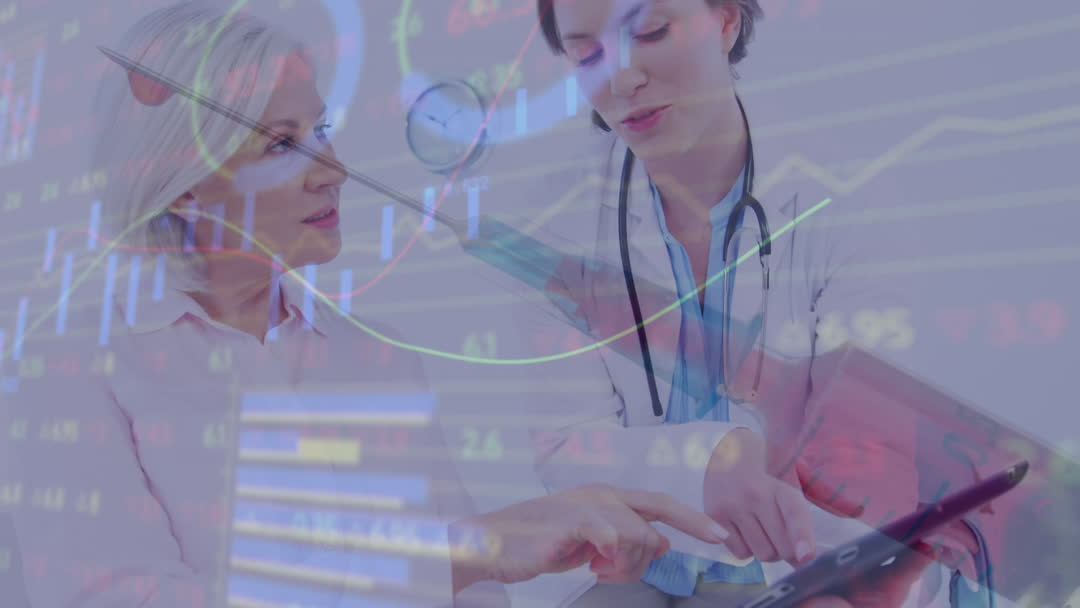 Medical professional engaging with senior female patient while examining digital data and graphs, symbolizes the integration of technology in healthcare. Useful for representations in medical journals, healthcare promotions, or discussing advancements in medical data analysis.