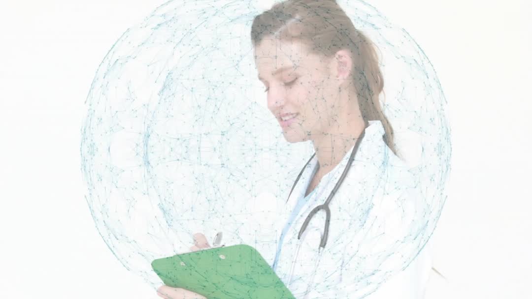 This depicts a medical professional writing on a clipboard enveloped in a digital network visualization, symbolizing health technology advancements. Ideal for illustrating clinical innovation, digital health data usage, and futuristic medical research concepts. Suitable for use in healthcare technology articles, medical research presentations, and education materials highlighting advancements.