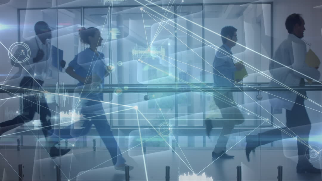 Animated composite of diverse healthcare professionals sprinting through a hospital setting overlaid with digital data and network lines conveys urgency and progress. Useful for themes highlighting advancements in medical technology, modern healthcare solutions, and efficient team dynamics. Suitable for use in presentations, websites, or articles related to medical tech evolution or hospital efficiency.