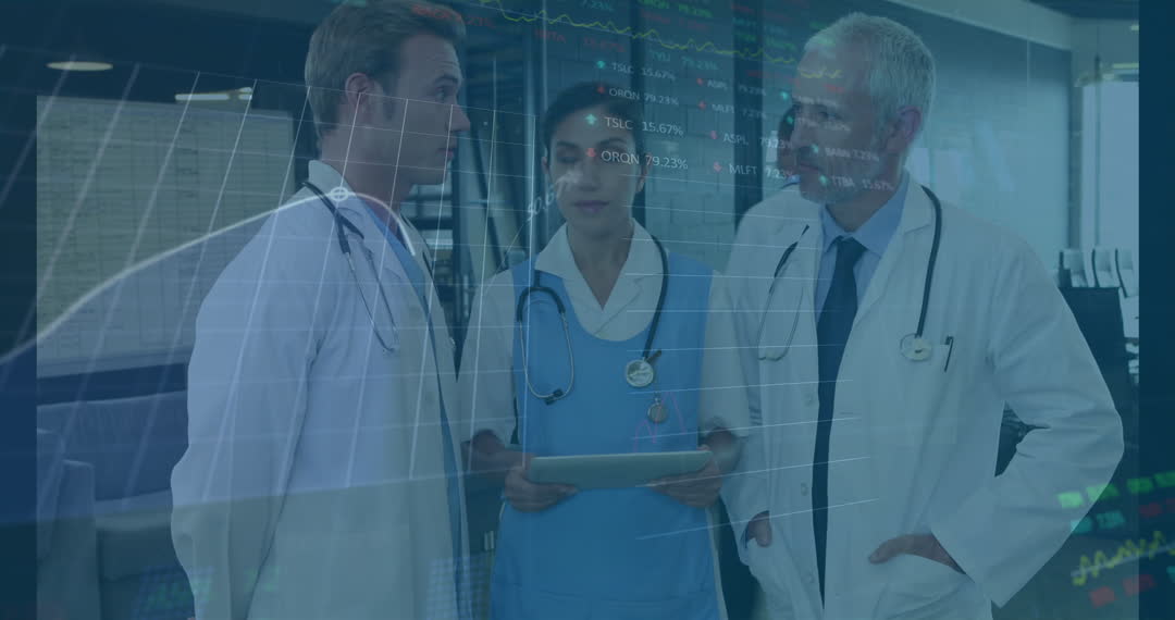 Team of doctors examines medical data, employing digital interfaces and modern technology to devise innovative healthcare solutions. Ideal for promoting advancements in healthcare, supporting presentations on medical technology, or illustrating articles about global medicine collaboration.