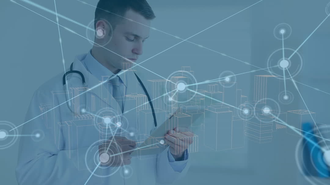 Doctor engaging with a tablet featuring a superimposed network grid symbolizing global communication and digital advancements in healthcare. Ideal for illustrating medical innovation, telemedicine, or network systems in modern healthcare facilities. Useful for articles, health industry presentations, or technology integration in medicine visuals.