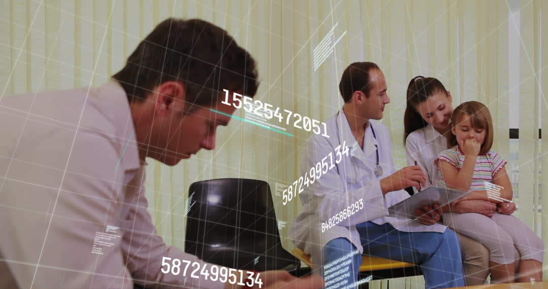 Animation showcases integration of technology in healthcare. Transparent numbers and digital lines over scene in waiting room highlight modern medical solutions and patient-doctor interactions. Suitable for projects on medical innovation, digital health services, or hospital practices. Great for illustrating advancements in healthcare technology and patient management systems.