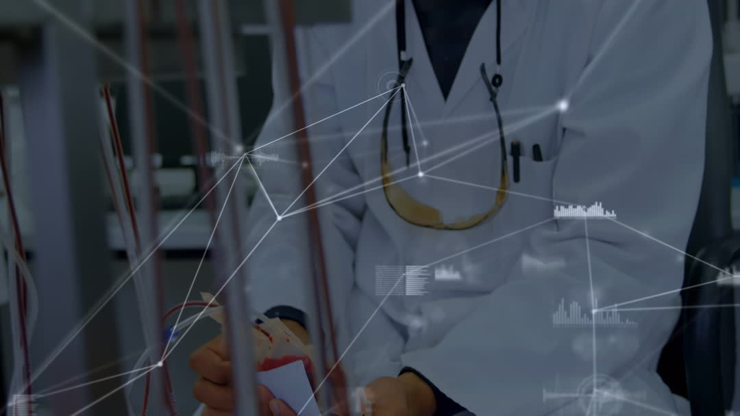 Doctor interacting with interconnected digital network in a medical environment. Subject embraces technological advances in healthcare, portraying modern medicine connecting with digital innovation. Ideal for illustrating concepts in cutting-edge medical technology, healthcare advancements, science-driven practices, and digital transformation in medicine.