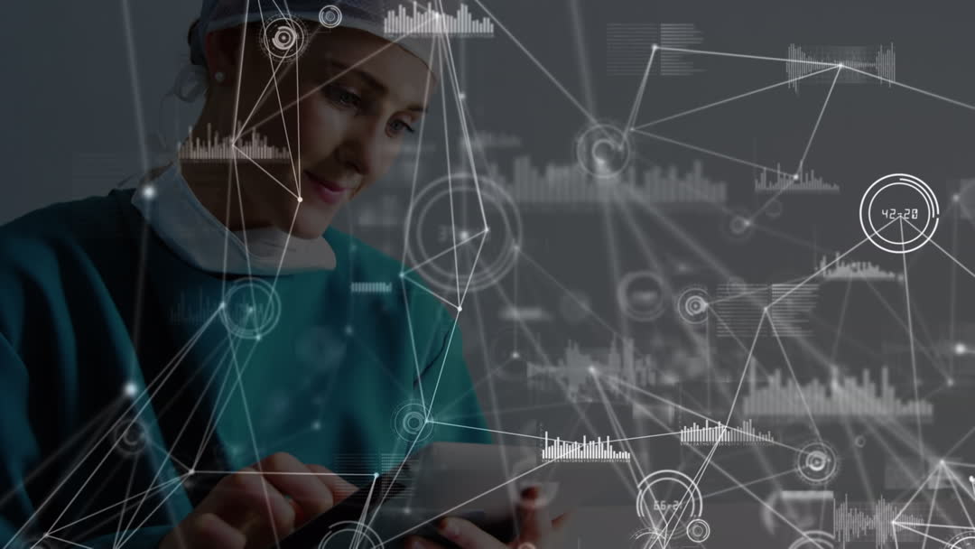 Medical professional engaged with digital tablet surrounded by illustration of interconnected data points, representing technological advancements in healthcare. Ideal for use in technology, healthcare innovation, and medical research to emphasize global connectivity and future developments in the industry.