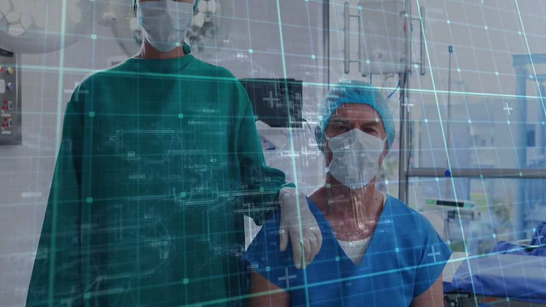 Caucasian male and female surgeons in hospital wearing scrubs and masks with digital grid overlay symbolizing cutting-edge medical technology in healthcare environments. Ideal for illustrating advanced surgical practices, promoting medical services, or discussing innovations in healthcare.