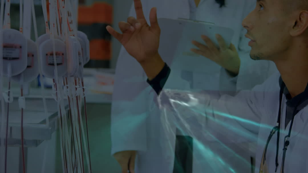 Scientists interact in innovative laboratory tackling digital research initiatives. Useful for illustrating themes of global scientific innovation, med-tech advancements, multidisciplinary teamwork.