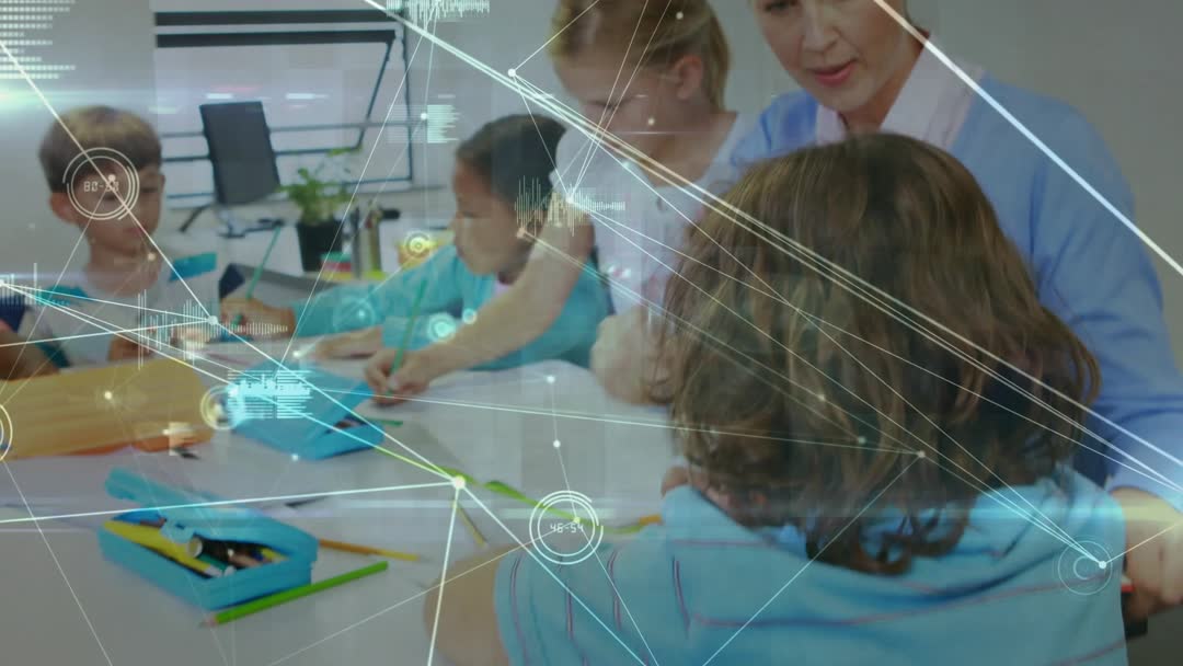 Children sit at a classroom desk, engaging with drawings while incorporating digital technology. A teacher guides their activity, portraying a blend of traditional and tech education. Decorative digital elements overlay, reflecting dynamic, innovative learning environment. Ideal for content related to inclusive education, modern teaching methods, and technology integration strategies.
