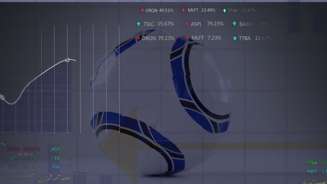 Dynamic visualization linking stock market data with sports technology, illustrating global economic trends. Useful for presentations on economic analytics, sports technology integration, or financial growth in the sports industry.