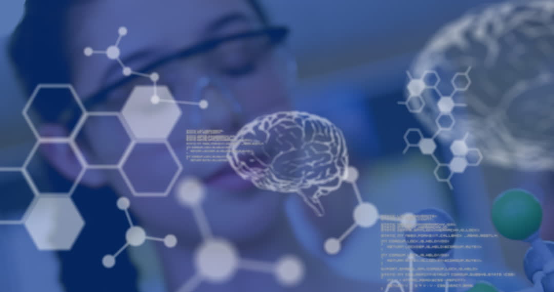 Overlay shows female scientist working in laboratory environment, symbolically interacting with digital renderings of brain and data. Video presents concept of advanced data analysis and scientific research. Useful for topics on future technology, scientific progress, innovation in healthcare.