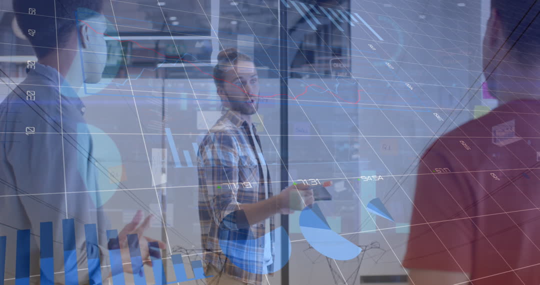 This video shows a manager explaining strategy to a diverse team with overlaid graphics of charts and numbers, symbolizing data-driven decision making and collaborative teamwork. Ideal for corporate brochures, presentations, or business blogs focusing on innovation, leadership, and succeeding in a tech-centric environment.