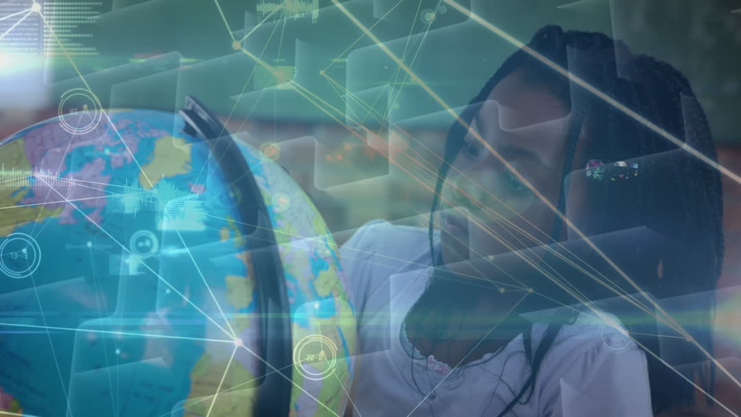 - Innovative Learning: African American Schoolgirl with Globe and Digital Connections