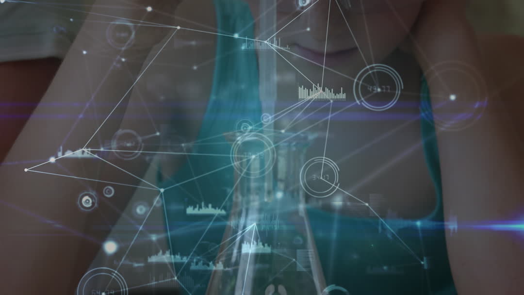 Caucasian schoolgirl involved in a scientific experiment with a digital network interface overlaying her activities. This symbolizes the integration of technology and education, highlighting themes of innovation and future learning. Ideal for use in contexts related to modern education, STEM programs, science resources, technological advancement in schools, or children's learning and development.