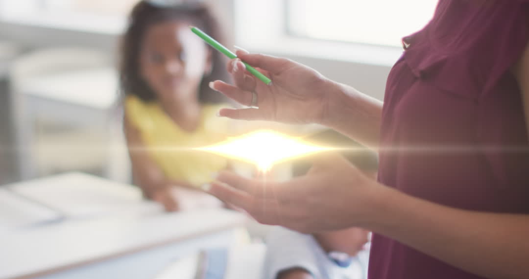 Teacher holding marker with light trails representing innovative concepts while students attentively look on. Ideal for advertisements or content focused on education technology, teaching methodologies, or student diversity.