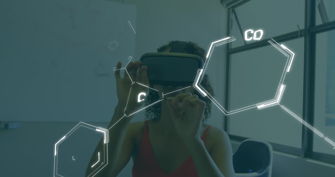 African American woman using a VR headset with superimposed chemical formulas represents the intersection of technology and education. Enhances immersive learning, making complex scientific concepts more accessible. Ideal for educational content, tech promotions, and articles about digital transformation in learning environments.