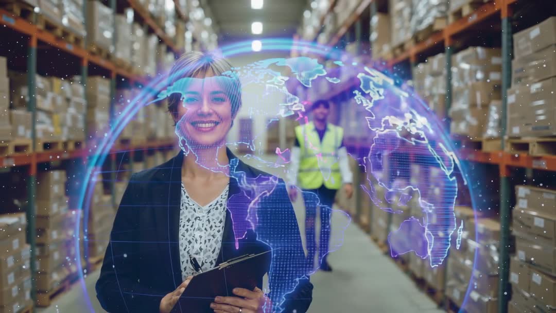 Innovative Logistics Manager with Digital Globe Overlay in Warehouse Video