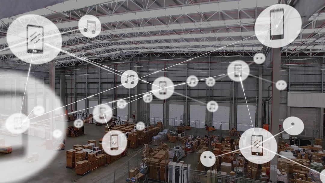 Visualization of digital connections showing smart technology in modern warehouse environment, representing efficient logistics and supply chain management. Useful for illustrating concepts of IoT implementation, technology in logistics, or future of warehousing.