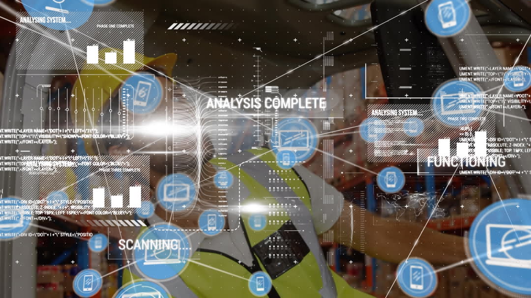 Depicts interconnected network of icons overlaying system in logistics environment, showcasing modern and efficient data processing technologies. Ideal for illustrating smart logistics operations, technology enhancing industrial processes, and futuristic workplace environments.