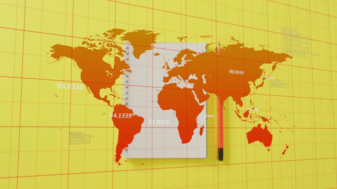 A creative video scene showcasing a notebook and pen interacting with an emerging orange map. As the map fades in, red grid lines and sliding coordinates introduce cartographic elements, ideal for educational, geographical planning, and technology-focused projects. This visual represents innovation in global mapping and planning ideas, suitable for illustrating topics of exploration, analysis, and international connectivity.