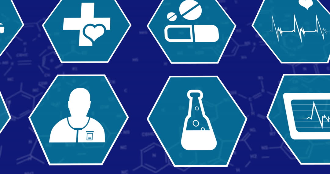 This illustration displays a series of medical and healthcare-related icons set against a blue background, including symbols like pills, cross with heart, doctor profile, and laboratory flask. Ideal for use in presentations or content relating to digital healthcare innovation, telemedicine platforms, pharmaceutical advancements, medical education, and futuristic healthcare systems.