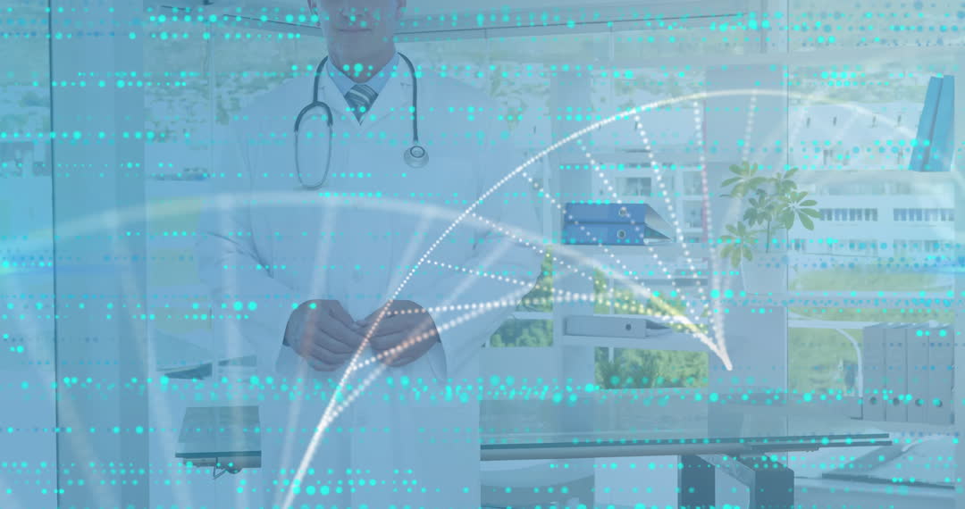 This visual combines modern technology with healthcare, representing innovative medical research. Featuring a doctor alongside a digital DNA structure, it illustrates advanced genetic study. Perfect for use in high-tech or healthcare marketing, educational content, and medical presentations highlighting genetics and technological integration.