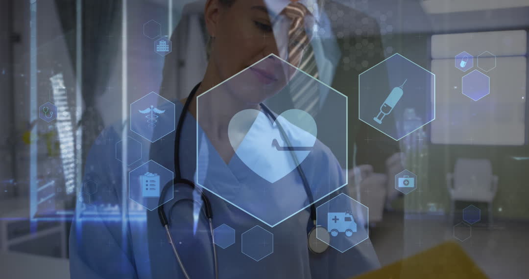 This visualization showcases a female doctor wearing a stethoscope with futuristic digital medical icons overlaying her background. The medical graphics indicate a forward-thinking approach, illustrating healthcare innovation. Suitable for use in promoting technological advancements in healthcare, digital interface efficiency in medical fields, and modern medical solutions. Ideal for educational materials, healthcare industry publications, and digital transformation features.