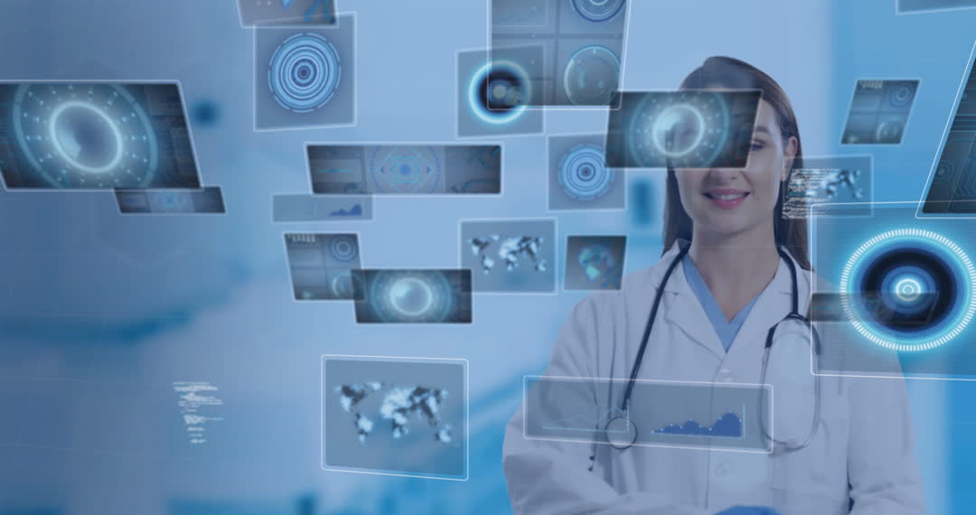 Smiling female doctor wearing a lab coat, interacting with digital holographic screens displaying medical data and global maps. Useful for illustrating concepts of modern healthcare advancements, digital health technologies, and the integration of artificial intelligence in medical diagnostics.