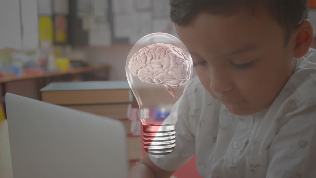 A young child engaged in classroom activities while a lightbulb with a brain symbolizes sparked creativity and technological focus. Ideal for concepts of educational innovation, creative thinking in learning environments, STEM education, student focus on task using technology. Useful for educational material promoting innovative teaching, technological advances in education, and fostering a creative mindset in young learners.
