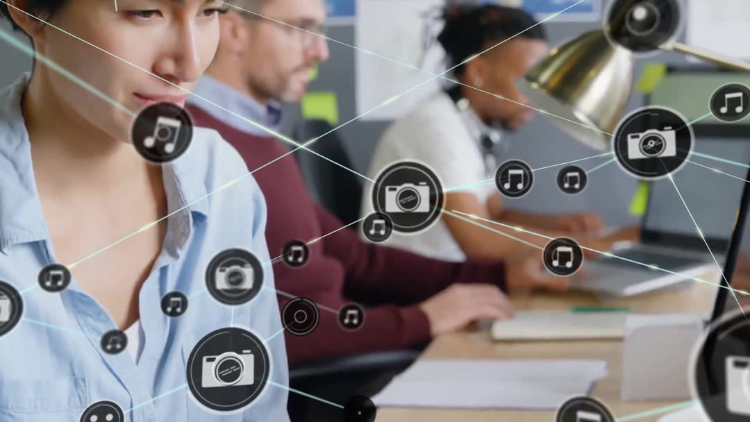 Depiction showcases a diverse group of business professionals engaged in work with overlaid iconography of network systems displaying multimedia and connectivity themes. Suitable for illustrating teamwork and innovation in technology-driven environments, this videory highlights global business perspectives and digital collaboration.