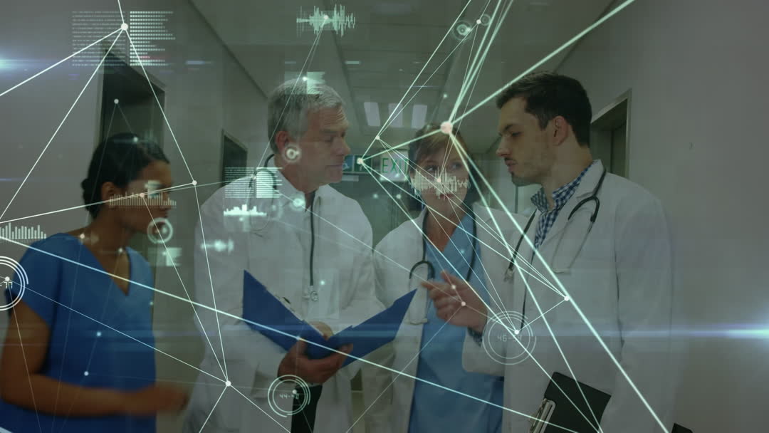 Diverse group of doctors collaborating in a hospital corridor with digital network interface overlay. Symbolizes modern innovations in healthcare and enhanced communication through technology. Useful for illustrating medical teamwork, technological advances in healthcare, and global connectivity in medical practice. Ideal for content related to interdisciplinary medical cooperation, health technology advancements, or digital transformation in hospitals.