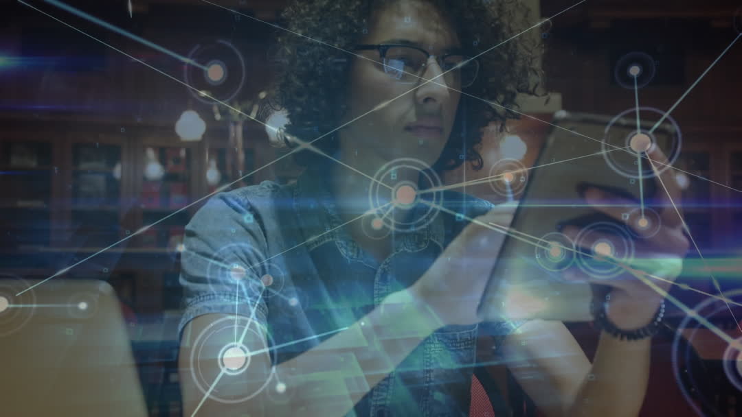 A mixed-race businessman interacts with advanced technology through a tablet, depicted with digital network overlays and connection icons. Represents modern business practices, global communication, and the integration of technology into daily operations. Ideal for illustrating concepts in technology marketing, corporate training, or business seminars on the latest digital trends.