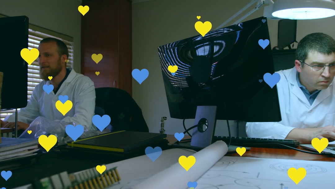 Two professionals concentrate on their individual tasks in a collaborative, high-tech workspace. Monitors and design equipment suggest a focus on technological innovation and digital creativity, ideal for corporate presentations or articles about modern office environments. Energetic mood enhanced by cheerful heart overlays add a creative and supportive teamwork theme.