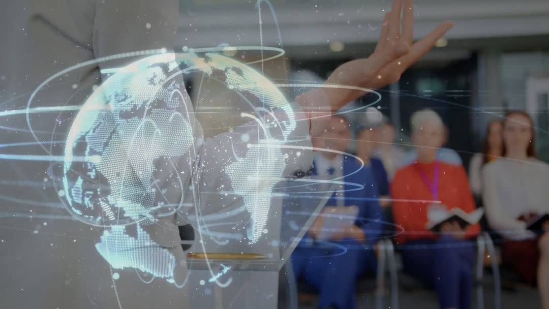 Image shows a presenter engaging audience with virtual globe and network lines depicting global connections. Great for visual narratives about technology, innovation, communication improvements, data strategies in modern corporate environments.