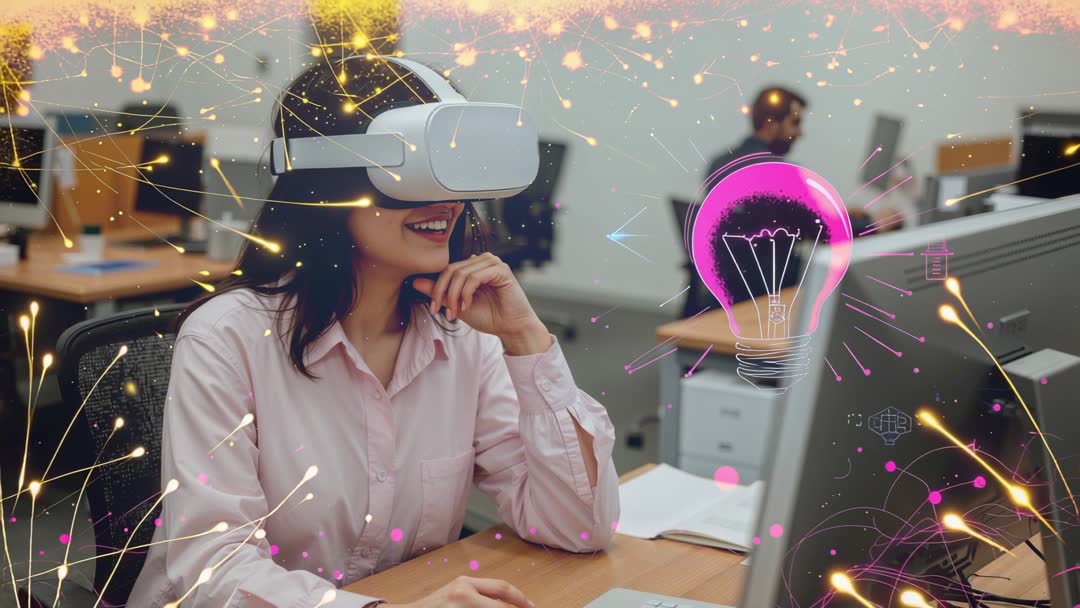 AI Generated Image. Woman wearing VR headset in office, exploring imaginative content symbolized by pink lightbulb. Captivates innovation theme showing digital future in workspaces. Useful for illustrating modern technology usage in professional settings, inspiring articles about VR applications, or conveying creativity and innovation in digital advertisements.