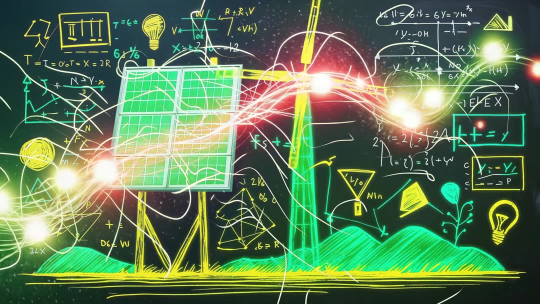AI Generated Video. This vibrant illustration combines elements of renewable energy such as solar panels and wind turbines with dynamic, pulsing energy currents and chalkboard schematics. Perfect for media demonstrating advancements in sustainable technologies, educational materials on energy exploration, or articles on innovative environmental solutions. The futuristic feel emphasizes both technological progress and environmental responsibility, ideal for websites or blogs focusing on green tech developments.
