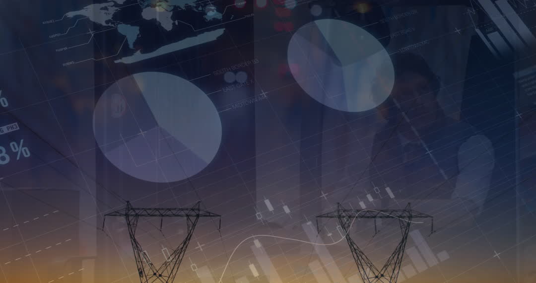 Animation visualizes intersection of energy industry and financial markets. Shows electricity transmission towers against financial graphs, symbolizing growth and economic importance of sustainable resources. Useful for explaining energy finance concepts in presentations, reports on renewable energy trends or technology impacts in environmental content.