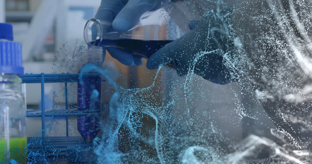 Scientist in a laboratory carefully pouring a solution into a test tube, with digital data streams symbolizing groundbreaking research and innovation. Ideal for articles on advanced scientific methods, cutting-edge technology in laboratories, or educational content about the intersection of science and data analytics.