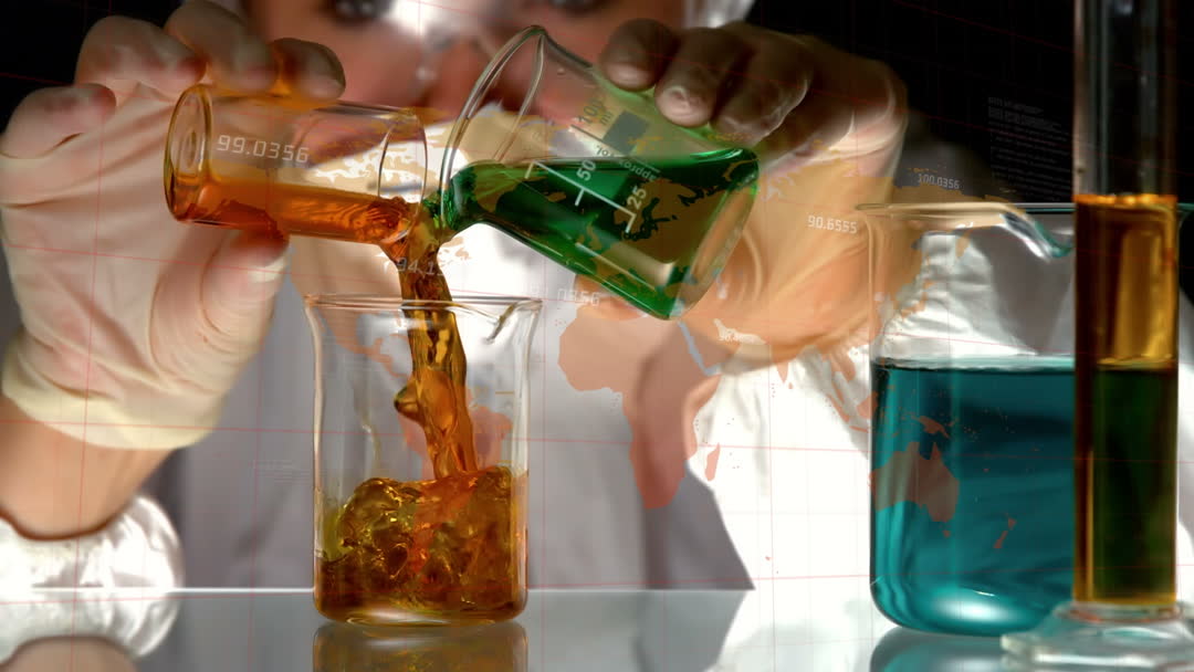 Caucasian scientist conducting experiment as data visualization overlays videos, symbolizing integration of scientific research with digital technology. Suitable for illustrating advanced scientific techniques, innovative laboratory research, or technological progress in scientific disciplines.
