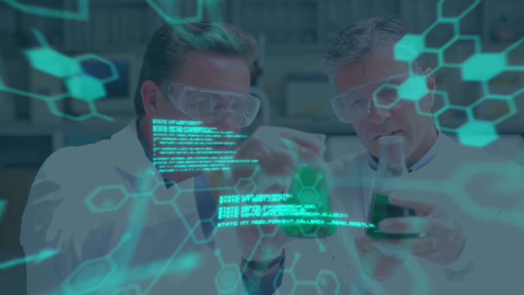 Two male scientists are analyzing chemical solutions in a laboratory. Advanced technology aids their research, illustrated by digital overlays representing data processing. Ideal for illustrating concepts of innovation and collaboration in scientific research fields, and emphasizing modern advancements in chemistry.