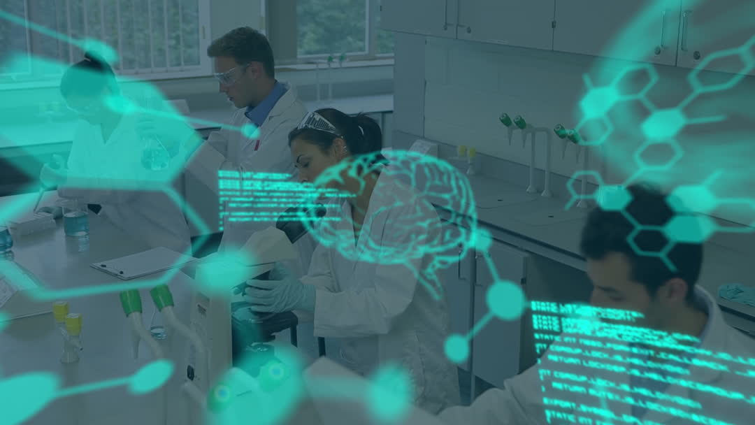 Group of scientists working in laboratory setting, engaged in research and data analysis activities. Digital overlay of scientific data, including brain schematics and molecular structures, suggests use of advanced technology and artificial intelligence in scientific exploration. Useful for presentations on scientific research, technology integration, educational materials, and visuals highlighting modern lab environments.